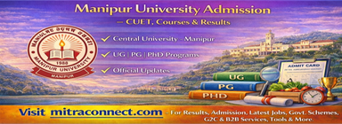 Manipur University is a key academic and research hub of North-East India, promoting inclusive education, regional studies, and interdisciplinary research. Students are advised to regularly check the official university website and MITRACONNECT.COM for the latest verified updates on CUET admissions, exams, results, and academic notifications.